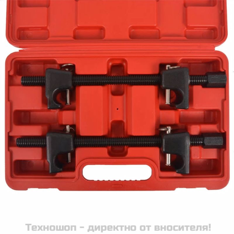Този комплект компресор за пружини е предназначен за компресиране на MacPherson strut пружини в повечето размери. Той позволява бързо компресиране на спиралната пружина, за да се смени амортисьора или пружинния комплект. Изработен от здрава стомана, комплектът е здрав и издръжлив, с ковани куки и подсилен централен винт, гарантиращ дълъг живот. Инструментите се доставят във формована кутия за лесно съхранение и транспортиране.