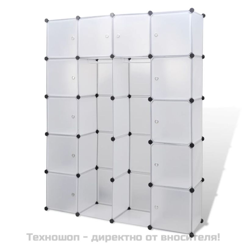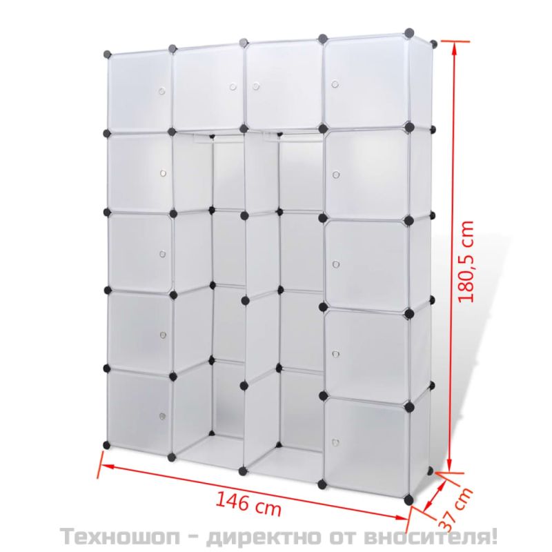 Този функционален модулен шкаф е не само много стилен, но ще поддържа вашите дрехи и обувки спретнато организирани. Ще бъде чудесно допълнение към вашата детска стая, всекидневна, коридор или спалня. Гардеробът е изработен от пластмасови елементи и хромирана стоманена тел, което го прави лесен за почистване. Благодарение на интелигентния си дизайн, шкафът може да се настрои бързо и лесно в различни конфигурации, според пространството или вашето настроение. Моля, избягвайте да натоварвате прекалено много рафтовете и имайте предвид, че пластмасата е запалима.