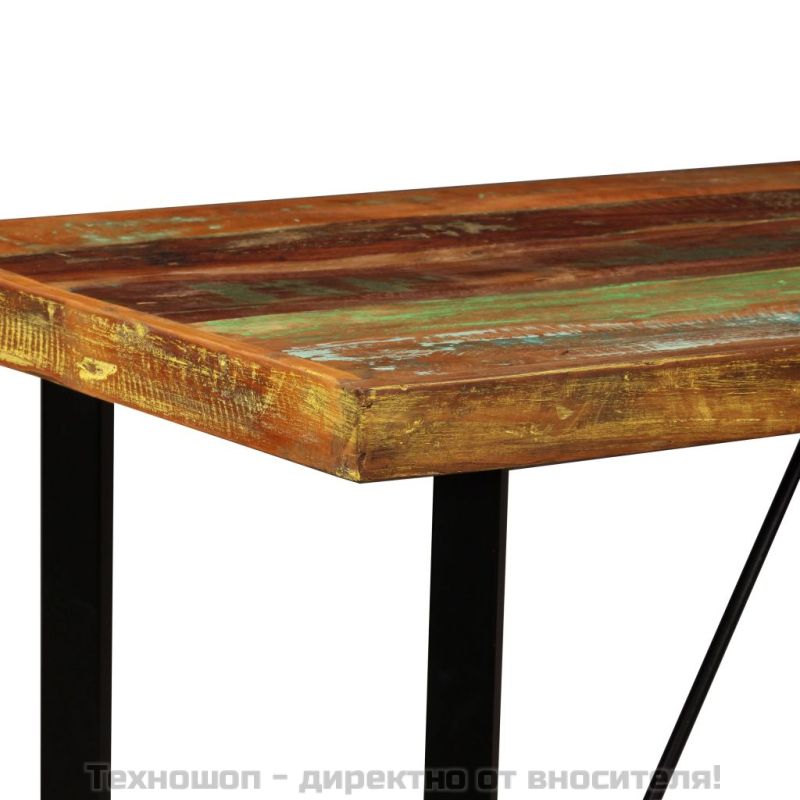 Този красив бар комплект има индустриален дизайн и ще бъде впечатляващо допълнение към всеки дом, бар или ресторант. Бар масата и столовете са изработени от регенерирана дървесина масив, което означава, че притежават характеристиките на различни видове дървесина като тиково дърво, мангово дърво, акация и др. Регенерираното дърво е здраво, стабилно, трайно и красиво. Признаците на износване придават уникален вид на всяка мебел, а стоманените крака допринасят за промишления стил. Всяка стъпка от процеса на изработване се извършва с най-голямо внимание, било то рекомбиниране, полиране, боядисване или лакиране. Доставката включва 1 бар маса и 4 бар стола. Монтажът е лесен. Важна забележка: Дървените шарки и цветове могат да варират, което прави всяка мебел уникална и малко по-различна от следващата; доставката е на случаен признак. Максимално 110 кг на седалка.