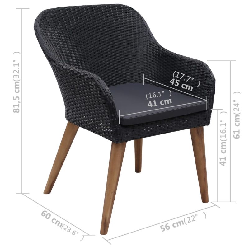 Създайте завладяваща и сплотена естетика във вашето открито пространство с този трапезен комплект за градина! Трапезната маса е изработена от масивна акациева дървесина с маслено покритие, което я прави стабилна, издръжлива и лесна за поддръжка. Тя е снабдена с прахово боядисана стоманена рамка, покрита с устойчив на атмосферни влияния РЕ ратан, което прави трапезните столове здрави и лесни за почистване. Ергономично проектираната форма и плътно подплатените възглавници доставят максимален комфорт при седене. Полиестерните калъфи на възглавниците се почистват лесно, като могат да бъдат свалени и изпрани. Важна забележка: Препоръчваме покриването на трапезния комплект по време на дъжд, сняг и скреж с цел максимално продължителна употреба.