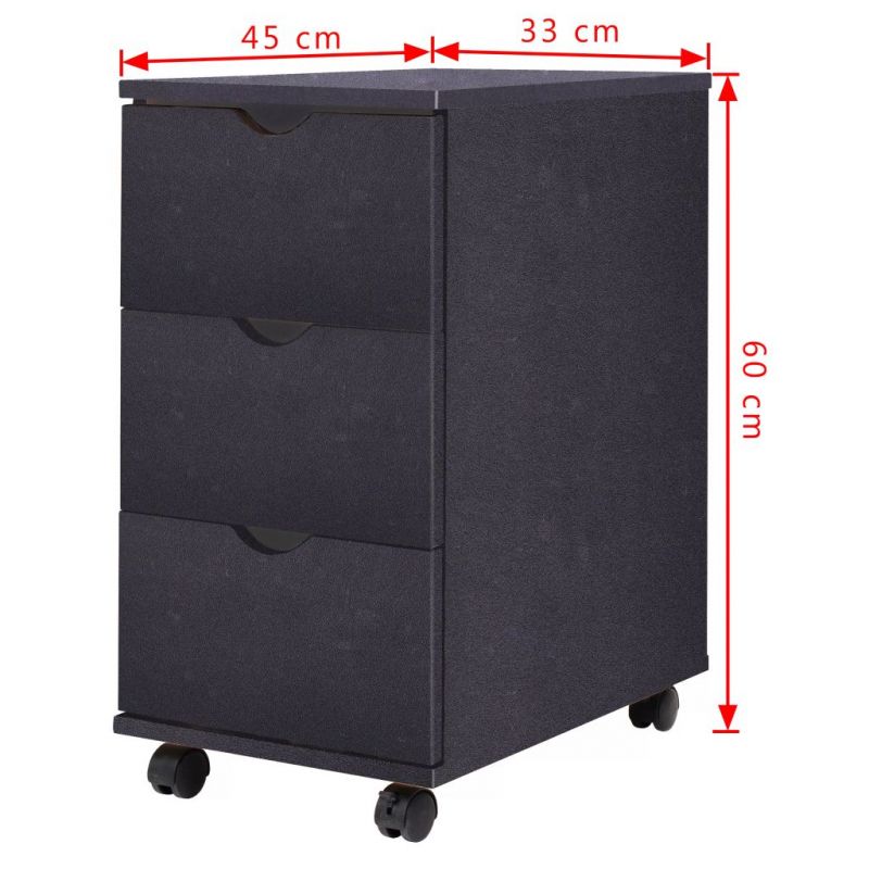Нашият модерен и стилен шкаф с чекмеджета ще бъде страхотно допълнение към вашия работен кабинет, офис или друг декор в хола. Шкафът се състои от рамка от инженерно дърво с пластмасови колелца и е стабилен и издръжлив. 3-те чекмеджета осигуряват достатъчно място за съхранение на различни предмети, спретнато организирани и достъпни. Колелцата позволяват на шкафа да се движи лесно и удобно. Този продукт е с лесен монтаж.