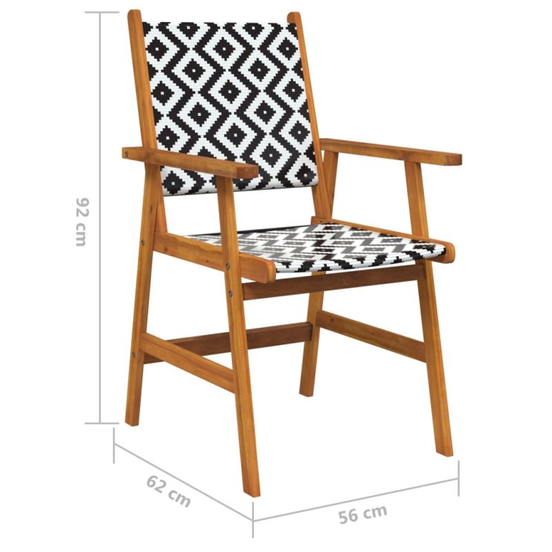 Тези дървени градински столове осигуряват идеалното място за отдих и любуване на слънцето в градината или вътрешния двор. Благодарение на облегалката и зоната за сядане от полиратан тези столове за открито могат да осигурят максимален комфорт при сядане и да се почистват лесно. Стабилните трапезни столове се отличават с изискана визия, която може незабавно да се впише във всяко жилищно пространство. Използвайте тези градински столове, за да добавите нотка на забавление и комфорт във вашата градина или вътрешен двор! Забележка: За да удължите живота на вашите градински мебели, ви препоръчваме да ги защитите с водоустойчиво покритие. Максимално 110 кг на седалка.