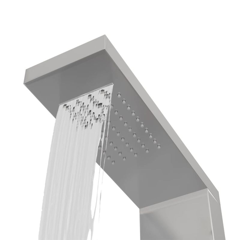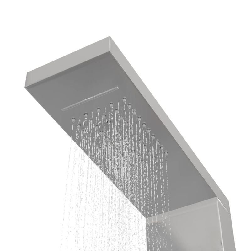 Тази многофункционална душ панелна система има стилен дизайн и ще бъде чудесно допълнение към вашата баня. Душ панелът е изработен от издръжлива неръждаема стомана с драскан ефект и има красив, квадратен дизайн. Той има четири функции: дъжд, водопад, масажни джетове и ръчна душ слушалка, които могат лесно да бъдат избирани с копче. Потопете се в истински релаксиращо водно усещане и се насладете на модерния стил на тази красиво проектирана панелна душ система!