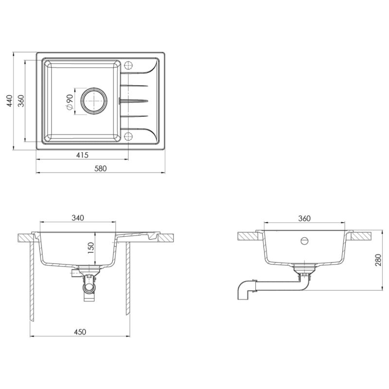 Тази кухненска мивка от гранит представлява класическо допълнение към вашия кухненски декор. Тя се отличава с екстра дълбоко корито с елегантен дизайн. Мивката е изработена от гранит, което я прави топлоустойчива, устойчива на надраскване и удари и лесна за почистване. Страничният отцедник ви дава допълнително място за вашите чинии. Тъй като мивката може да се завърта изцяло, тя може да бъде монтирана с коритото наляво или надясно. Включена е и цедка за сифон за лесно отстраняване на отпадъците. Дренажният отвор е с диаметър 90 мм. Тази кухненска мивка е подходяща за горен монтаж/монтаж върху плот. Децата трябва да бъдат наблюдавани, за да се гарантира, че не играят с уреда. Пазете децата далеч от зоната за сглобяване. Внимание: Прочетете внимателно инструкциите преди употреба и ги запазете за по-нататъшни справки.