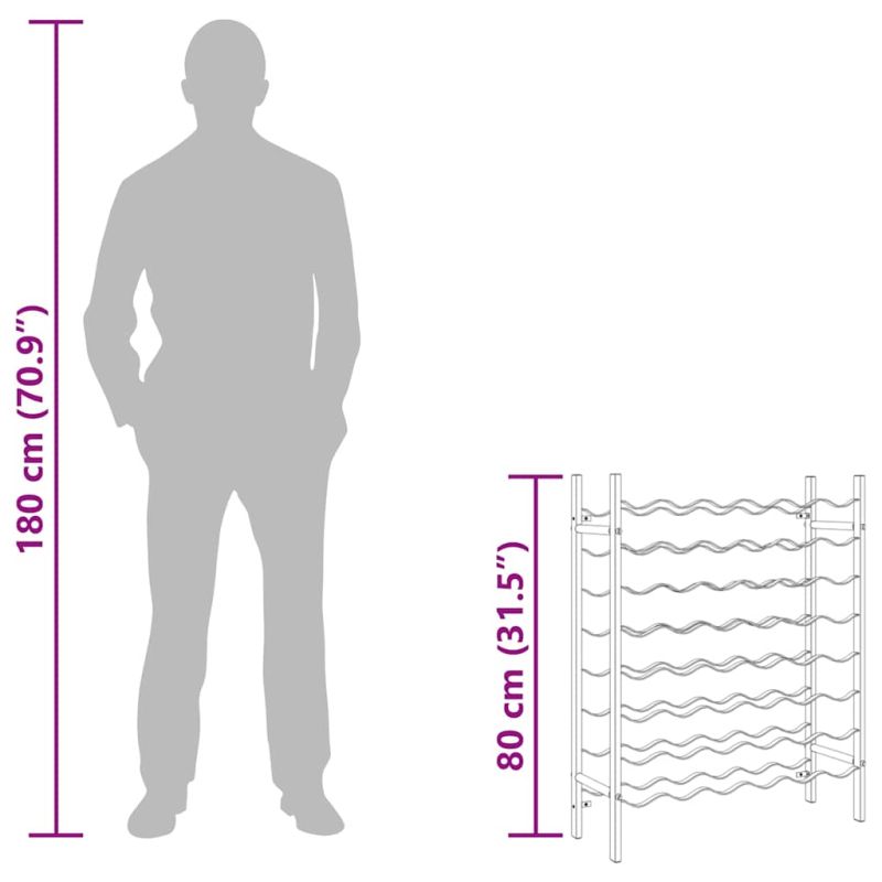 Този стелаж за вино е удобен, за да ви помогне да организирате и съхранявате любимите си вина. Достатъчно място за съхранение:Стойката за вино има 8 нива, които могат да поберат до 48 бутилки вино. Всяко ниво може да побере 6 бутилки.Модерен дизайн:Тази стойка за вино също е модерно допълнение за съхранение на вино в модерни кухни, килерчета и барове.Високо качество: Рафтът за бутилки е изработен изцяло от метал и не ръждясва и не се деформира. Освен това повърхността е много гладка, което може да предотврати надраскването на бутилката. Внимание:За да се предотврати преобръщане, този продукт трябва да се използва с предоставената приставка за стена.
