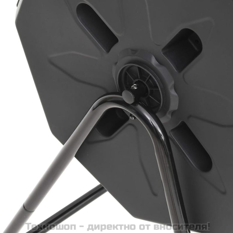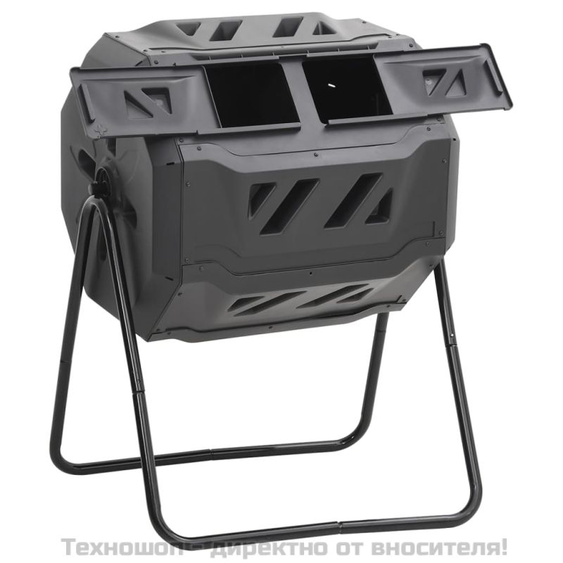 Този градински компостер помага за ускоряване на разграждането на органичната материя и да подготвите сами тор. Лесно използване: Просто напълнете коша с градински и кухненски отпадъци и го завъртайте по няколко пъти на ден. Благодарение на въртящия се на 360 градуса дизайн не е нужно да бъркате отделно компоста.Практичен дизайн: Кошът за компост с две отделни камери е много удобен. Докато от едната страна разграждането вече е в ход, от другата страна можете да допълвате нов материал. Ефективна вентилация: Вентилационните отвори и дълбоките жлебове улесняват преместването на компоста с въздух, както и разтрошаването на буците на място. Черният контейнер абсорбира добре топлината, което благоприятно способства процеса.Отличен избор: С коша можете да ускорите разлагането. Друго предимство на компостерът е да затрудни достъпа на плъховете до вашия компост.