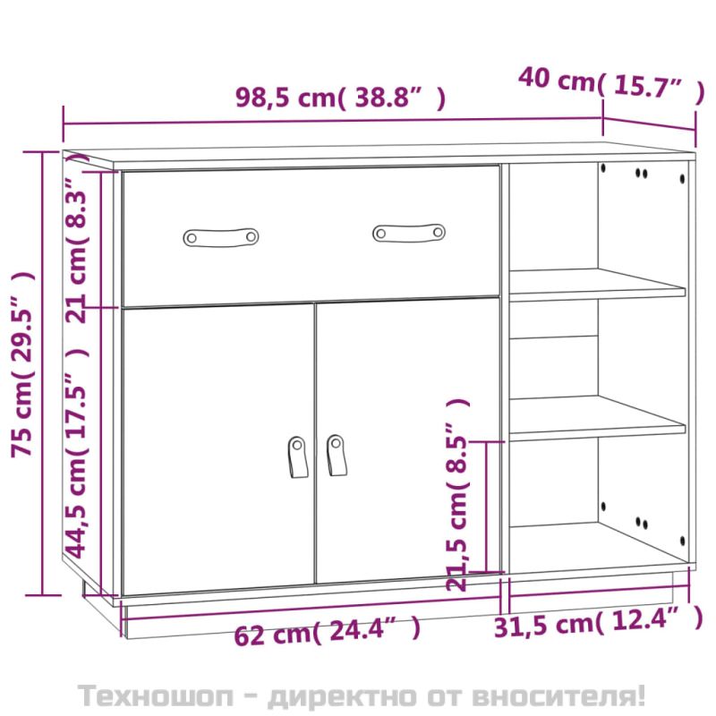 Този дървен бюфет е предназначен да задоволи вашите различни изисквания и е отлично допълнение към вашата стая. Масивна борова дървесина: Масивната борова дървесина е красив естествен материал. Боровата дървесина е с продълговати шарки, а чеповете придават на материала характерния му рустик вид.Стабилна рамка: Дървената рамка осигурява здравина и стабилност.Достатъчно място за съхранение: Сайдбордът осигурява достатъчно място, за да държите нещата си организирани и леснодостъпни.Здрав плот: Плотът на този бюфет е идеален за излагане на вашите декоративни предмети, рамки със снимки и саксийни растения. Внимание:За да се предотврати преобръщане, този продукт трябва да се използва с предоставената приставка за стена. Забележка:Всеки продукт се доставя с ръководство за сглобяване в кашона за лесно сглобяване.