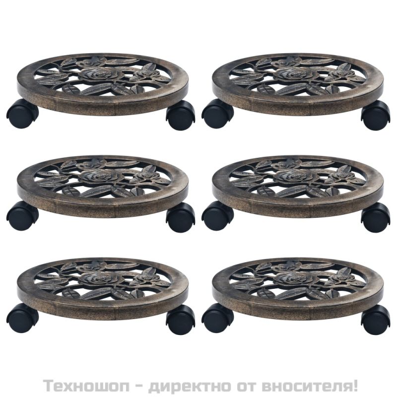 Поставки за цветя на колелца, 6 бр, бронз, 30 см, пластмаса