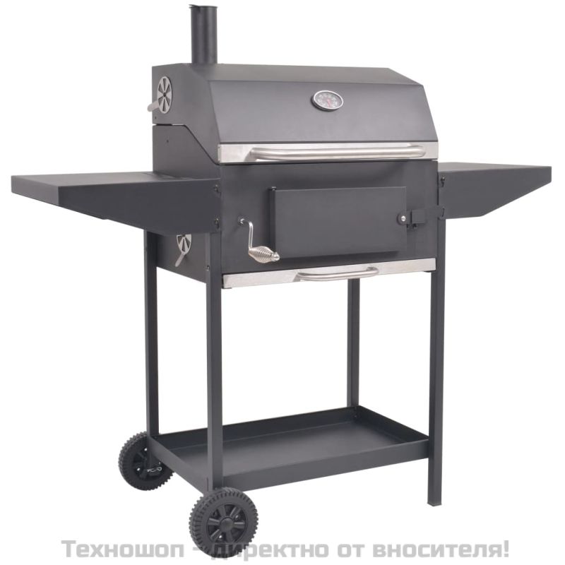 С този здрав опушвач на дървени въглища, състоящ се от голяма камера за готвене и здрава камина, можете удобно да печете на скара и опушите вкусно месо, риба и зеленчуци. Перфектно запечатаното, дебело метално тяло дава на нашия опушвач отлични характеристики на задържане на топлина и топлинно разпределение. Можете да следите температурата в камерата с вградения термометър на капака. Опушвачът има и две странични маси, на които можете да поставите подправки, съставки, прибори и други важни неща за барбекю. Също така можете да съхранявате предмети на рафта отдолу. Благодарение на дръжката от неръждаема стомана, отварянето на камерата е безопасно и удобно. Опушвачът е оборудван с 2 колела, за да може лесно да се движи навън за партита на открито, пикници и събирания. ВНИМАНИЕ: Не използвайте спирт или бензин за запалване или припалване! ПРЕДУПРЕЖДЕНИЕ! Не използвайте на закрито! ПРЕДУПРЕЖДЕНИЕ! Това барбекю става много горещо. Не го премествайте по време на работа. Дръжте децата и домашните любимци настрана. GPSR