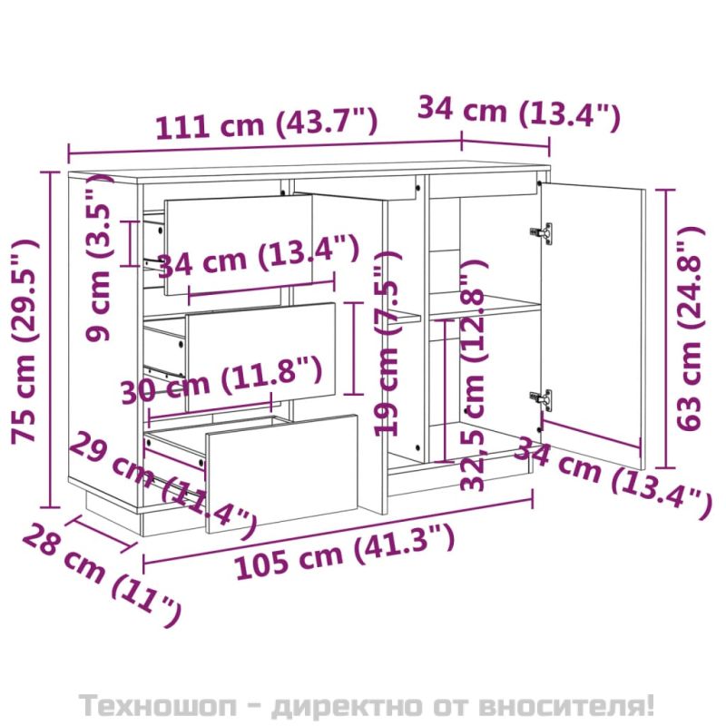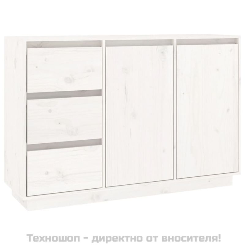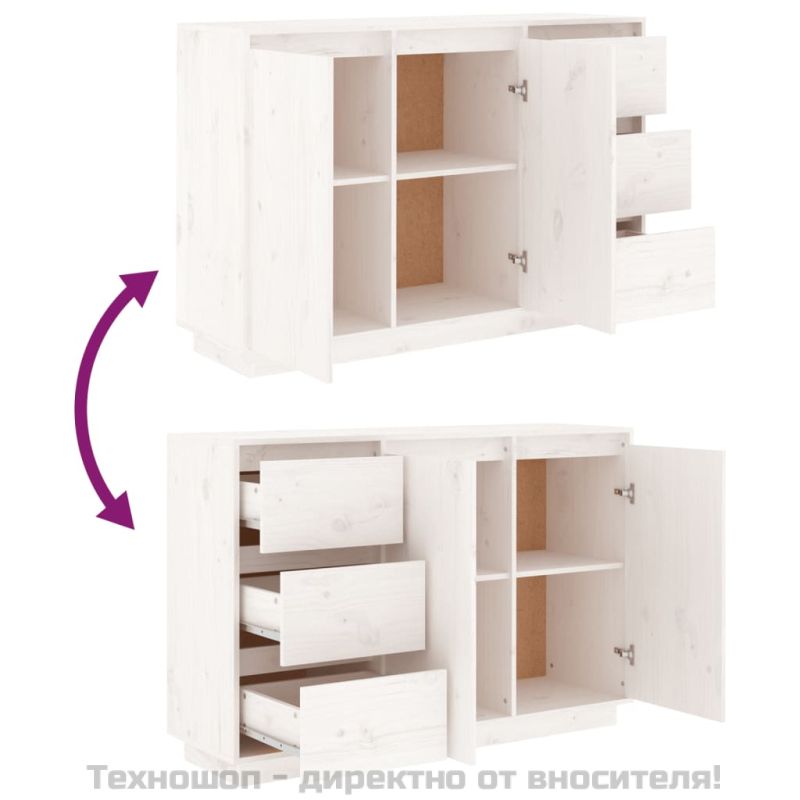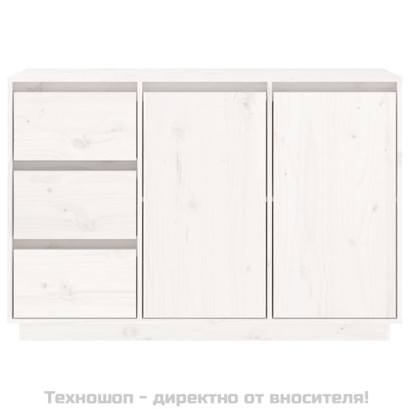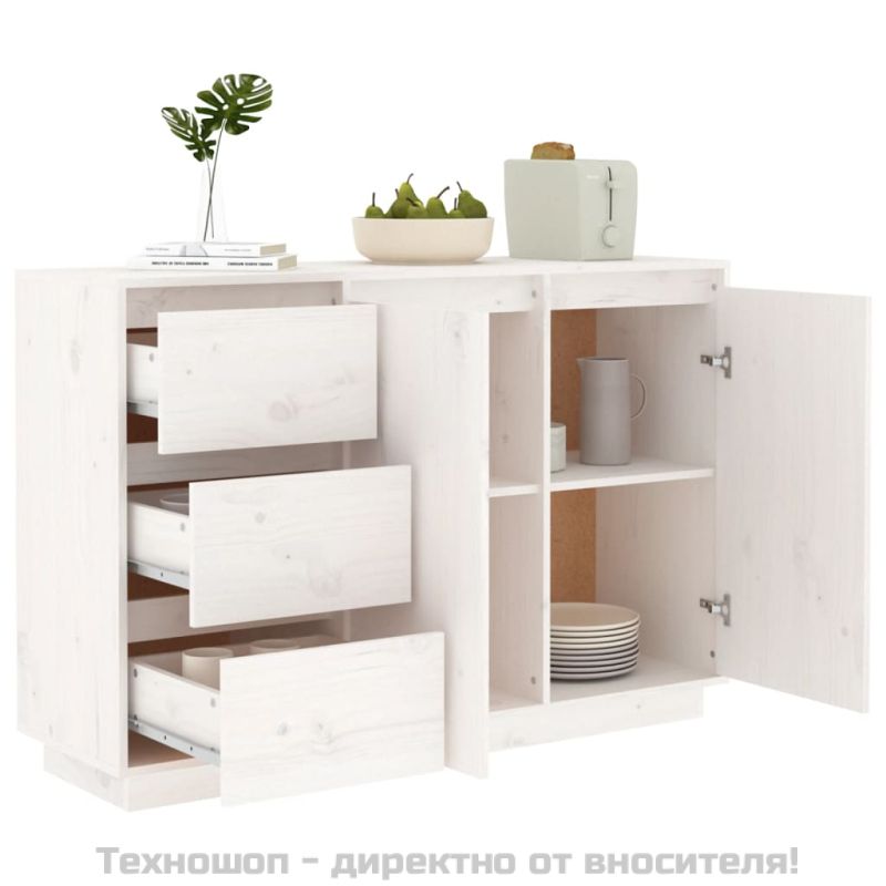 Този дървен бюфет е идеално допълнение към вашата спалня и хол, създавайки трайно впечатление! Първокласен материал: Масивната борова дървесина е красив естествен материал. Обработете повърхността с масло, восък, лак или стъклен финиш за по-здрава повърхност и лесно почистване. Боровата дървесина има прави шарки, а възлите придават на материала характерния му рустик вид.Достатъчно място за съхранение: Оборудван с 2 врати и 3 чекмеджета, този страничен шкаф осигурява достатъчно място за съхранение, за да държите различните си вещи добре подредени и на една ръка разстояние.С функция за декорация: Стабилната горна част е идеална за подреждане на декоративни предмети, фоторамки и саксийни растения. Внимание:За да се предотврати преобръщане, този продукт трябва да се използва с предоставената приставка за стена.