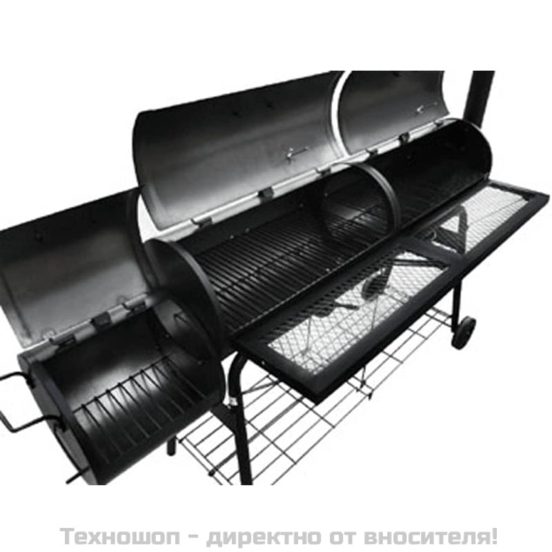 Това барбекю е комбинация от традиционно и опушващо барбекю. Можете да гриловате, опушвате, изпичате или просто да поддържате храната гореща. В отделението за огъня, тлеещо дърво отделя топлина и пушек, които се разпределят равномерно в опушвателя. Докато приготвяте храна по определен начин, другата част от повърхността може да използва за поддържане на храната гореща. "Nevada" има едно отделение за огъня и две опушващи камери. Месо, риба, зеленчуци, пица и дори хляб могат да се приготвят вкусно в опушвателите. Вкусът на приготвената храна може да се повлияе от вида на дървото, което използвате. Ястията могат да се приготвят на ниска температура, което позволява на рибата и месото да останат сочни и вкусни. Опушвателят има две широки разделения за грил. Термометърът ви позволява да следите темепературата в опушвателя. Допълнителният рафт на дъното ви осигурява място да съхранявате дърва. Забележка: Препоръчваме да използвате покривало за барбекю (не е включено), за да предпазите продукта от неблагоприятни метеорологични условия. ВНИМАНИЕ: Не използвайте спирт или бензин за запалване или припалване! GPSR