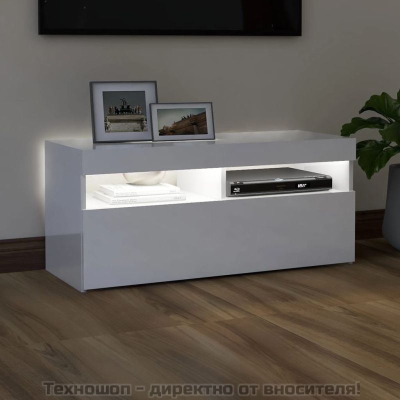 ТВ шкаф с LED осветление, бял гланц, 90x35x40 см