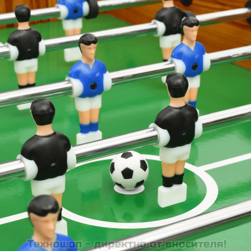 Да притежавате джага с професионални размери във вашия собствен дом вече е възможно с нашата 121-сантиметрова футболна маса. Тя ще внесе много забавление във всяка обстановка, бивайки идеална за домашна стая с игри, зала за аркадни игри, както и за други зони за забавление. Тази футболна маса е подходяща за състезание един на един или за групова игра. Масата е изработена от здрав МДФ и хромирани стоманени пръти, благодарение на което ще функционира години наред. Размерите на отпечатаното игрище отговарят на официалния турнирен стандарт, което ви осигурява реалистично изживяване. Има 8 редици, по 4 на отбор, 11 черни играчи и 11 сини играчи, както и държач за чаша от всеки край, за да се поддържате хидратирани, докато конкуренцията загрява. Оборудвана с гъвкави плъзгащи се пръти с играчи с нехлъзгащи се дръжки, тя ви предлага лесно и удобно захващане. Нейната функционалност за лесно сгъване прави съхранението лесно. Когато дойде времето за игри, масата може лесно да се сгъне обратно, осигурявайки часове забавление за семейството ви. Ще бъде доставен пълен комплект маса за джаги, включваща 2 футболни врати, 2 футболни топки, 2 табла за отбелязване на резултати, 8 пръта с играчи и 22 играча.