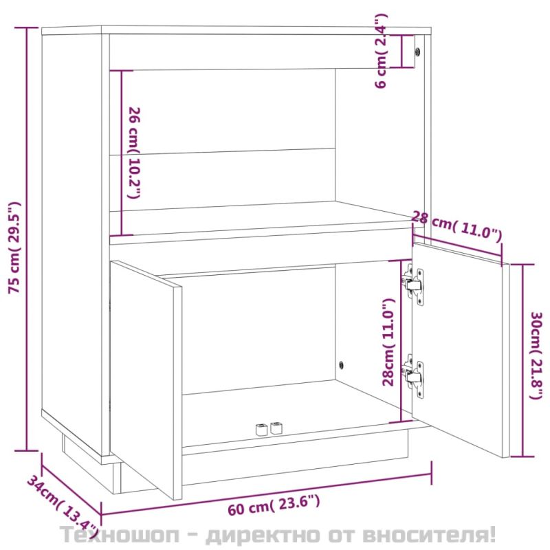 Този дървен бюфет е идеално декоративно и практично допълнение към съществуващия ви декор. Шкафът за съхранение е изработен от масивна борова дървесина, което го прави стабилен и здрав. Страничният шкаф осигурява достатъчно място за съхранение на книги, мултимедийни уреди и други предмети. Стабилният плот е идеален за подреждане на декоративни предмети, фоторамки и саксийни растения.