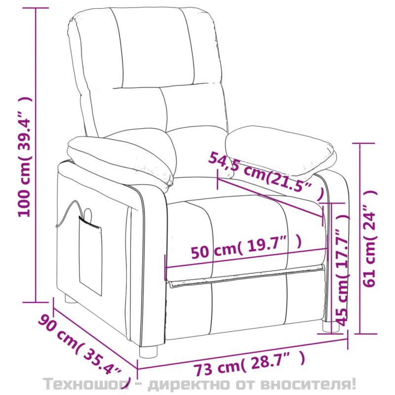 Облегнете се и се отпуснете в този изключително комфортен масажен стол! Функция за ръчно накланяне: Накланящият се стол е специално проектиран с 3 позиции на наклон, така че да можете да регулирате ръчно облегалката и поставката за крака според вашето удобство.Функция за вибрация: Представените 6 масажни точки ви позволяват да изпитате по-целенасочен масаж. Освен това включеното ръчно управление ви позволява да избирате различни програми за масаж. Функцията за масаж се захранва от USB конектора, но сертифицираният 5V USB източник на захранване не е включен.Удобно седене: Дебело подплатената седалка, облегалката и широките подлакътници, покрити с текстил, осигуряват уютно и топло усещане, което ви кара да се чувствате като в прегръдка, докато седите. Тъканта се отличава със семпъл и изчистен вид и е дишаща и издръжлива.Здрава и стабилна рамка: Рамката, изработена от дърво и метал, осигурява здрава структура и стабилност. Този накланящ се фотьойл е удобен и издръжлив. Този продукт се захранва с DC 5V, но сертифицираният 5V USB източник на захранване не е включен в комплекта. Моля, обърнете внимание, че трябва да използвате само сертифициран вход DC 5V. По-високото напрежение може да доведе до прегряване и да повреди устройството, както и до потенциален риск от прегряване и пожар.