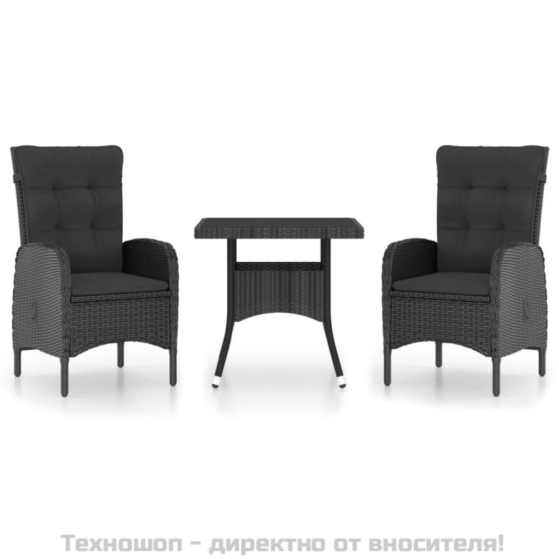 Градински трапезен комплект, 3 части, полиратан и стъкло, черен