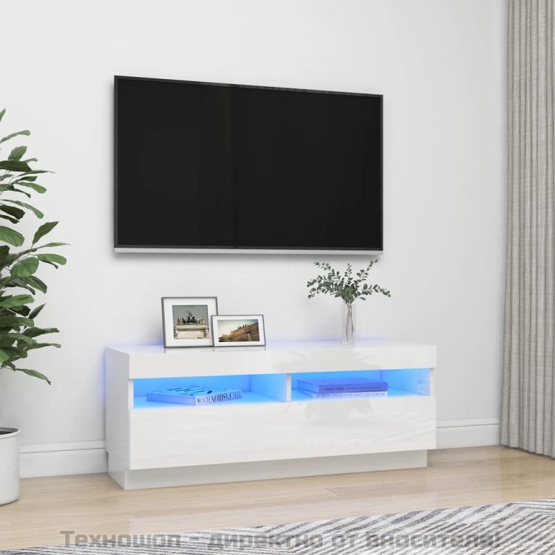 ТВ шкаф с LED осветление, бял гланц, 100x35x40 см