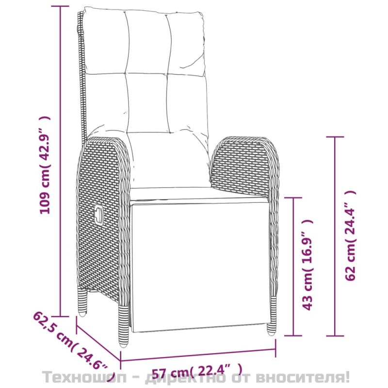 Този модерен градински трапезен комплект, отличаващ се с елегантен и съвременен дизайн, е чудесен избор за вечеря или почивка във вашата градина. Материал, устойчив на атмосферни влияния: PE ратан, известен също като полиратан, е устойчив на атмосферни влияния и лесен за почистване. Той остава красив отвън за дълъг период от време. Предлага отлично качество, удобство и естетичен вид.Здрава рамка: Прахово боядисаните стоманени рамки правят комплекта за хранене на открито здрав и стабилен за ежедневна употреба на открито.Практичен плот: Гладкият плот на градинската маса е изработен от закалено стъкло, което се почиства лесно с влажна кърпа. В допълнение, здравият плот е идеален за поставяне на ястия, напитки и други декоративни елементи.Функция за накланяне: Градинските столове са специално проектирани с функция за накланяне, така че да можете да регулирате облегалката според вашето удобство.Удобно седене: Облегалката добавя повече комфорт при седене на градинския стол. Освен това дебело подплатените възглавници осигуряват комфорт по време на седене. Добре е да се знае:За да бъде сглобяването възможно най-лесно, всеки продукт се доставя с ръководство. Забележка:За да сте сигурни, че вашите външни мебели ще останат красиви, ви препоръчваме да ги защитите с водоустойчиво покривало. Максимално 110 кг на седалка. Съобразете се с риска от открит огън и други източници на силна топлина в близост до продукта.