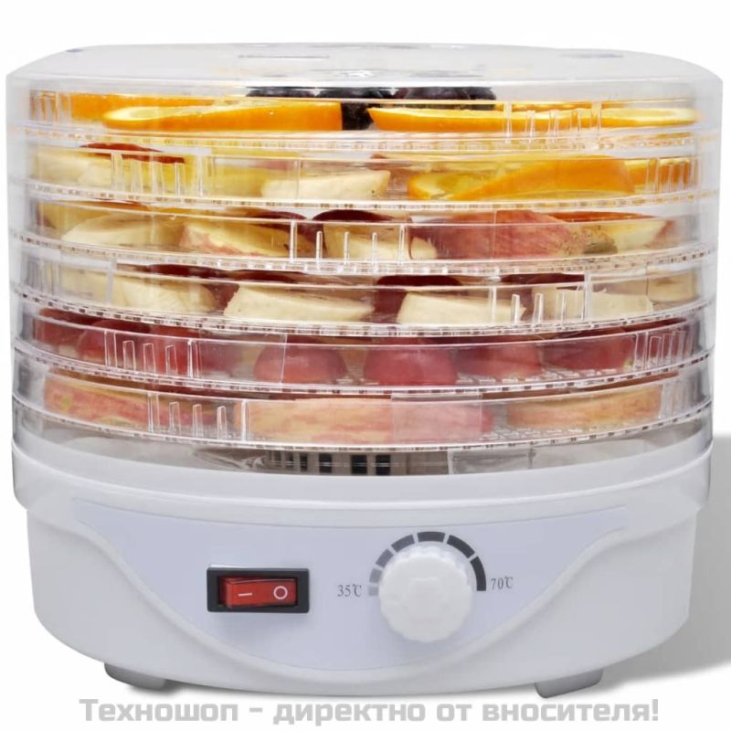 Този дехидратор за храни с 6 тавички е едно чудесно допълнение към вашата кухня. С негова помощ ще можете не само лесно да изсушавате широка гама от пресни продукти като плодове, зеленчуци, гъби и билки, но също и да приготвяте здравословни закуски за вашето семейство. Когато храните се изсушават, естествените аромати и захари се концентрират, поради което ще имат по-сладък и по-силен вкус от прясната храна. Сушенето запазва важните хранителни вещества, които готвенето често разрушава. И тъй като не добавяте захар или други добавки, сухите храни са вкусни и здравословни закуски за вашето семейство. Освен това, дехидратираната храна ще издържи по-дълго и е по-лека за носене. Дехидраторът има прозрачен капак, за да можете да наблюдавате процеса на сушене. И той намалява значително времето за сушене; ще имате вкусна суха храна за часове, не за дни! За разлика от традиционното изсушаване с въртящи се тави, той използва вентилатор, който усилва радиалния въздушен поток, допринасяйки за равномерно изсушаване на храната във всички тавички, без да се смесват ароматите. Също така уредът е снабден с регулируема система за контрол на температурата, за да се приспособи към различните изисквания на различните храни. Този ефективен дехидратор е лесен за използване: просто го измийте, поставете храната в тавичките, задайте желаните температура и включете уреда. Само за няколко часа и храната е изсушена и готова за консумация или складиране. Спестете пари чрез направата на свои собствени пастърма, сушени плодове и зеленчуци, мюсли и много други. Този уред не е предназначен за използване от лица (включително деца) с намалени физически, сетивни или умствени способности или с недостатъчен опит и познания, освен ако не са получили надзор или инструкции за използването на уреда от лице, отговорно за тяхната безопасност. Този продукт не е играчка. Не позволявайте на деца да си играят с уреда.