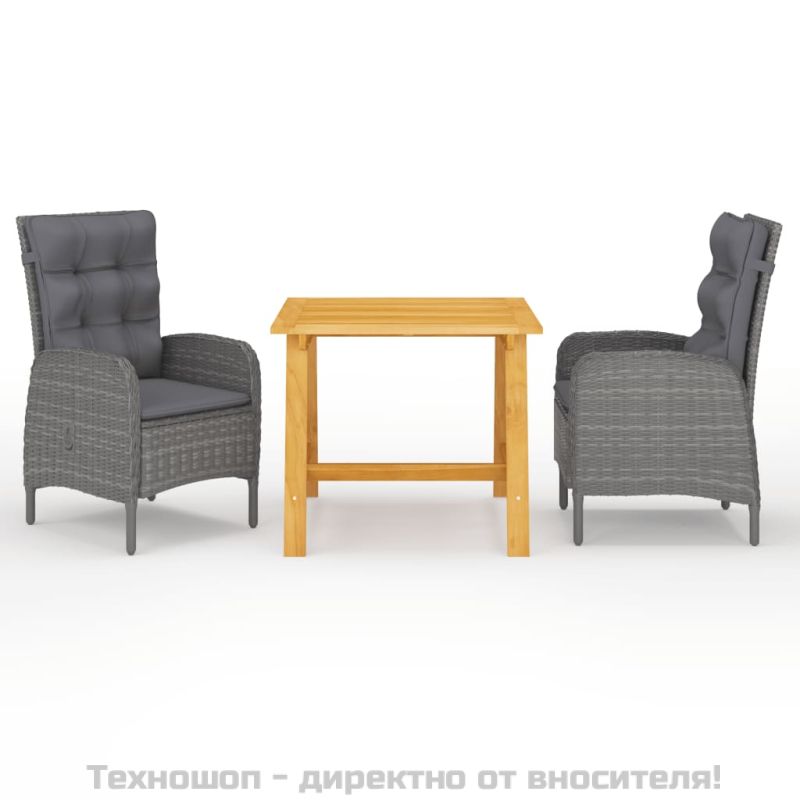 Създайте завладяваща и сплотена естетика във вашето открито пространство с този трапезен комплект за градина! Трапезната маса е изработена от масивна акациева дървесина с маслено покритие, което я прави стабилна, издръжлива и лесна за поддръжка. Прахово боядисаната стоманена рамка, покрита с устойчив на атмосферни влияния РЕ ратан, прави тези трапезни столове здрави и лесни за почистване. Проектиран с извита облегалка и подлакътници, трапезният стол има по-ергономична форма за максимален комфорт. Освен това накланящите се столове ви осигуряват целия необходим комфорт. Облегалката се наклоня при дърпане на бутона отстрани. Включени са възглавници за допълнителна опора, а калъфката с цип се сваля лесно за пране. Важна забележка: Препоръчваме покриването на трапезния комплект по време на дъжд, сняг и скреж с цел максимално продължителна употреба.
