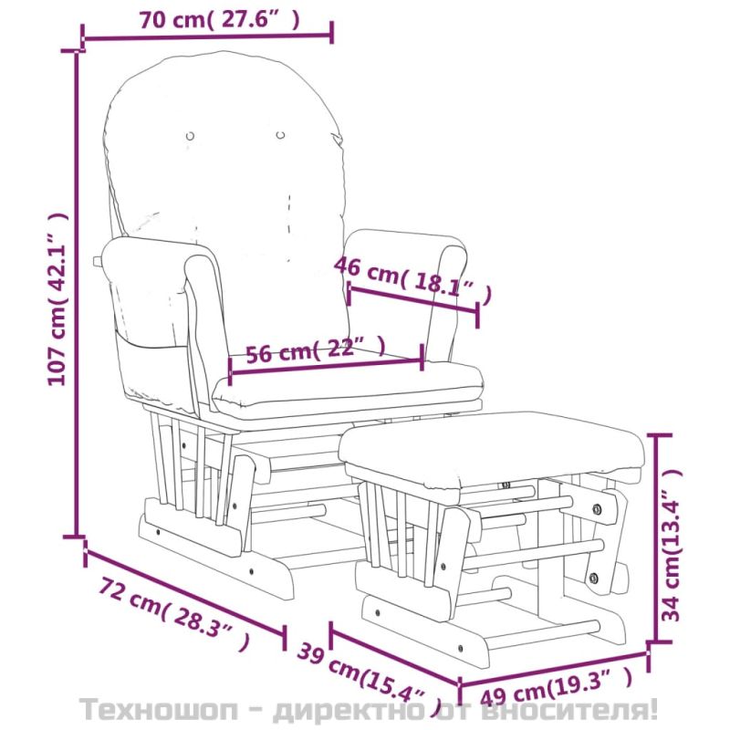 Отпуснете се и се насладете на свободното си време с този стилен плъзгащ стол с табуретка! Плъзгаща функция: Релаксиращият стол и включената поставка за крака могат да се плъзгат напред-назад, което го прави идеален за хранене и успокояване на вашето бебе. Широко приложение: Този плъзгащ се стол за кърмене може да се използва навсякъде у дома, независимо дали се грижите за бебето си в детската стая или си почивате във всекидневната или спалнята.Издръжлив материал: Масивното каучуково дърво е красив естествен материал. Каучуковото дърво има плътно зърно и е удароустойчиво и издръжливо. Тъканта се отличава със семпъл и изчистен вид и е дишаща и издръжлива.Удобно седене: Плъзгащият се фотьойл е с дебели възглавници и тапицирани подлакътници, за да осигури вашия комфорт.Удобен дизайн: Този плъзгащ се стол за кърмене има странични джобове, които ви позволяват да държите дребни предмети за лесен достъп. Добре е да се знае:За да бъде сглобяването възможно най-лесно, всеки продукт се доставя с ръководство. Максимално 110 кг на седалка. Съобразете се с риска от открит огън и други източници на силна топлина в близост до продукта.