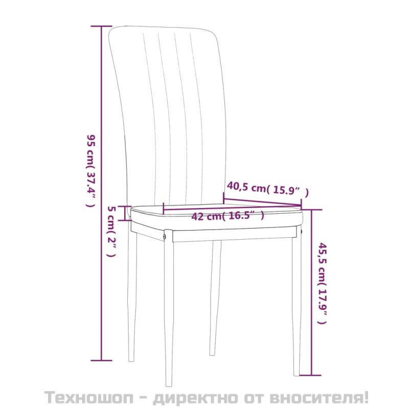 Тези трапезни столове, отличаващи се със семпъл, но елегантен дизайн, са предназначени да привличат вниманието във вашето жилищно пространство. Меко кадифе: Тези столове са изработени от кадифе. Кадифето е мека и луксозна материя, която се отличава с гъста купчина равномерно отрязани влакна за гладка повърхност. Кадифената тъкан се отличава с меко усещане, което я прави удобна/приятна на допир.Здрава и стабилна рамка: Железните рамки на тези трапезни столове осигуряват здравина и стабилност.Удобен трапезен стол: Облегалката на кухненския стол се отличава с хубав дизайн и е подплатена с пяна, осигурявайки максимален комфорт при седене. Забележка:Всеки продукт се доставя с ръководство за сглобяване в кашона за лесно сглобяване. Максимално 110 кг на седалка. Съобразете се с риска от открит огън и други източници на силна топлина в близост до продукта.