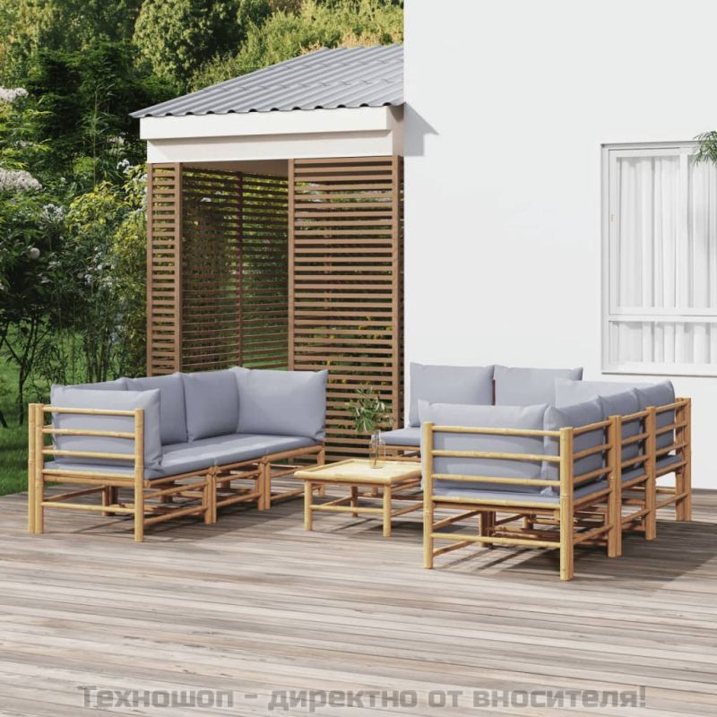 Градински лаундж комплект 9 части светлосиви възглавници бамбук