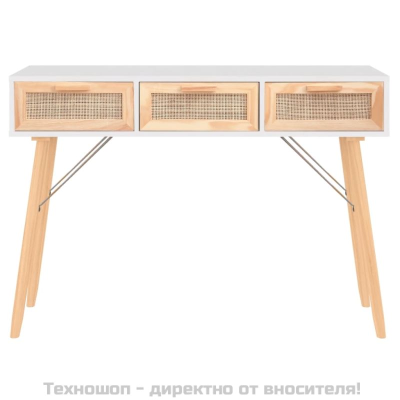 Конзолна маса, бяла, 105x30x75 см, бор масив и естествен ратан