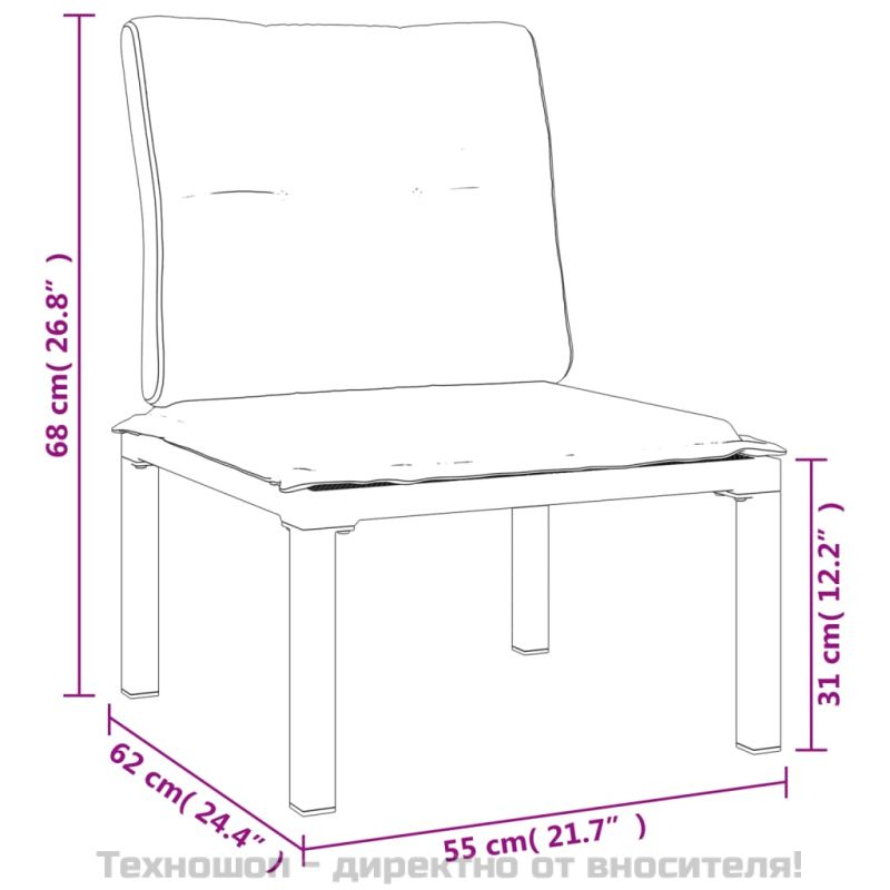 Този модерен градински лаундж комплект, отличаващ се с елегантен и съвременен дизайн, е перфектен избор за почивка във вашата градина. Материал, устойчив на атмосферни влияния: PE ратан, известен също като полиратан, е устойчив на атмосферни влияния и лесен за почистване. Той остава красив отвън за дълъг период от време. Предлага отлично качество, удобство и естетичен вид. Здрава и стабилна рамка: Прахово боядисаната стоманена рамка на лаундж комплекта осигурява здравина и стабилност.Удобно седене: Облегалката добавя повече комфорт при седене на стола. Освен това дебело подплатените възглавници осигуряват комфорт по време на седене.Модулен дизайн: Градинският комплект за отдих е гъвкав и лесен за преместване, така че можете да го комбинирате с други модулни сегменти в уеб магазина, за да създадете свои собствени лични конфигурации за отдих в градината!Практична маса: Здравият плот на градинската масичка за кафе е идеален за поставяне на ястия, напитки и други декоративни елементи. Добре е да се знае:За да бъде сглобяването възможно най-лесно, всеки продукт се доставя с ръководство.Забележка:За да сте сигурни, че вашите външни мебели ще останат красиви, ви препоръчваме да ги защитите с водоустойчиво покривало. Максимално 110 кг на седалка. Съобразете се с риска от открит огън и други източници на силна топлина в близост до продукта.