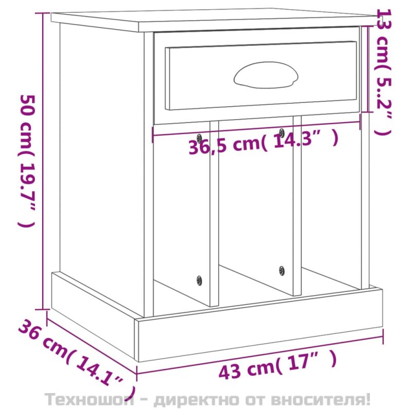 Това нощно шкафче с елегантен дизайн е непреходно допълнение към вашия интериорен декор. Издържлив материал: Инженерната дървесина е с изключително качество с гладка повърхност и също така се отличава със здравина, стабилност и устойчивост на влага. Достатъчно място за съхранение: Нощното шкафче е проектирано с чекмедже и 3 отделения, където да държите вещите си подредени и леснодостъпни. Здрав и стабилен плот: Плотът на страничния шкаф е идеален за излагане на вашите декоративни предмети, рамки със снимки и саксийни растения. Добре е да се знае:За да бъде сглобяването възможно най-лесно, всеки продукт се доставя с ръководство. Внимание:За предотвратяване на преобръщане този продукт трябва да се използва с предоставения анкер за стена.