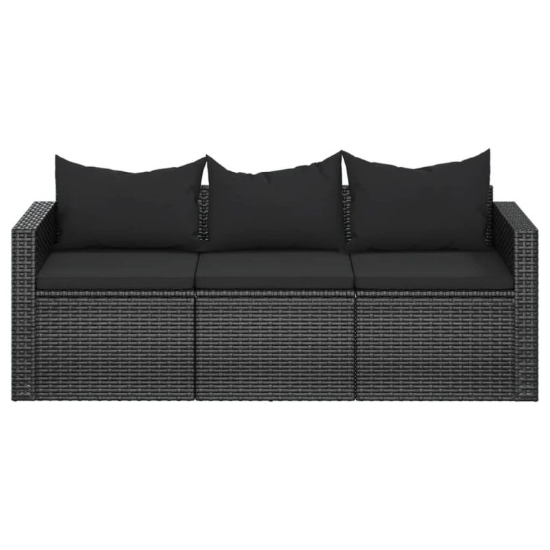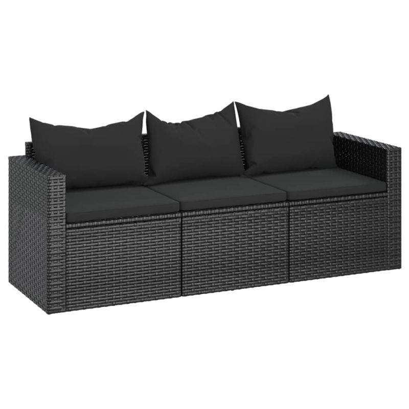 3-местен градински диван с възглавници, черен, полиратан
