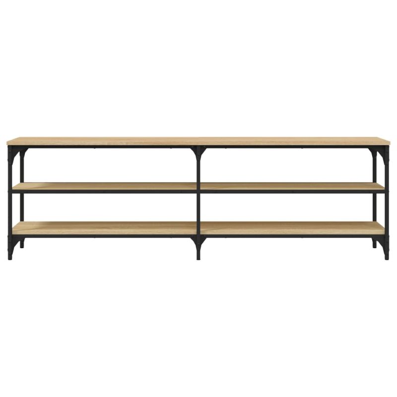 Този ТВ шкаф с индустриален дизайн добавя винтидж нотка към вашата стая! Издържлив материал: Инженерната дървесина е с изключително качество с гладка повърхност и също така се отличава със здравина, стабилност и устойчивост на влага.Отворени рафтове за съхранение: ТВ поставката има 3 отворени рафта, които са идеални за поставяне на приемници, DVD и игрови конзоли.Стабилна рамка: Желязната рамка на ниския шкаф осигурява здравина и стабилност.Регулируеми крачета: ТВ шкафът е оборудван с 4 регулируеми крачета, които могат да предпазят пода от надраскване и да го поддържат стабилен върху леко неравен под.Декоративна функция: Здравата горна част на ТВ модула е идеална за нареждане на декоративни предмети, като рамки за снимки и растения. Внимание:За предотвратяване на преобръщане този продукт трябва да се използва с предоставения анкер за стена.