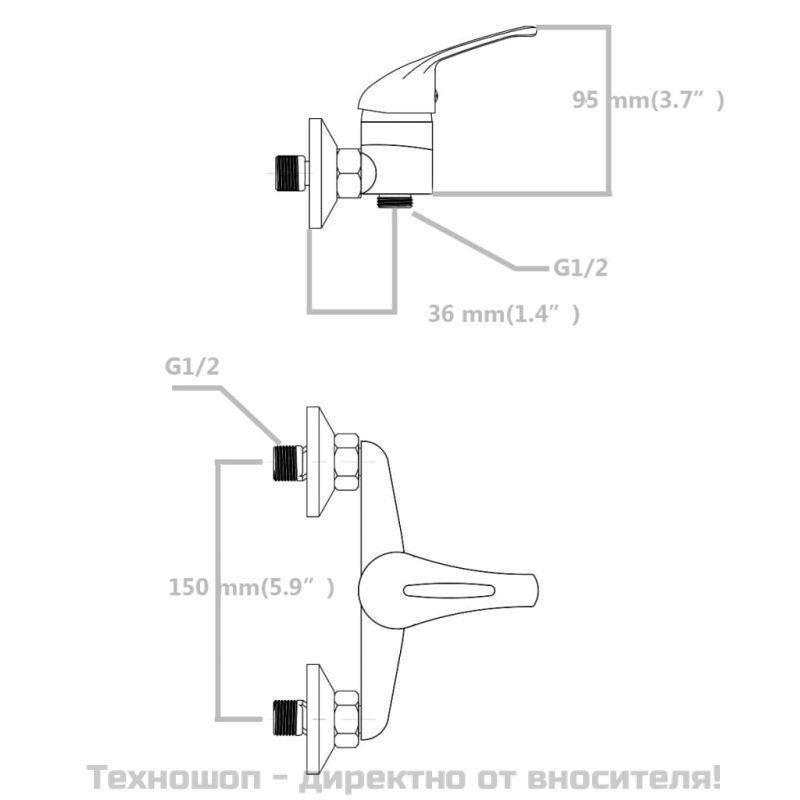 • Разстояние между центъра на студените и топлите тръби: 150 мм