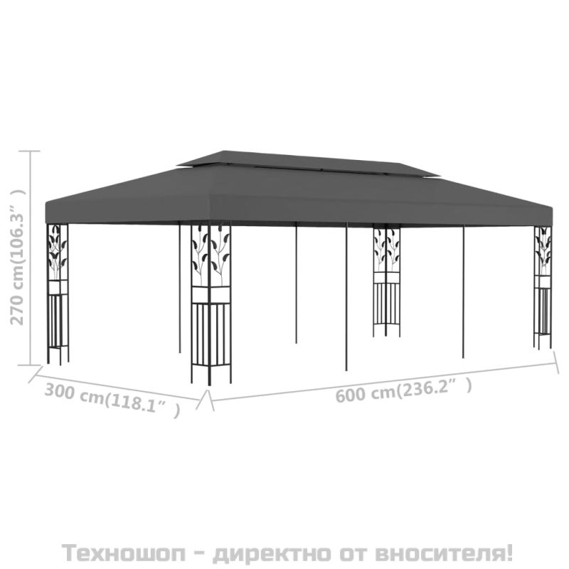 Тази просторна шатра с декоративни флорални детайли ще се превърне в елегантно допълнение към вашето външно жилищно пространство. Градинската шатра с вентилиращ покрив ще попречи на слънцето и дъжда да развалят забавленията по време на семейни събирания, барбекюта, следобедни пикници и рождени дни. Парти шатрата има прахово боядисана стоманена конструкция с декоративни флорални детайли, както и покрив от полиестер с PA покритие, което я прави устойчива на UV лъчи и вода. Благодарение на подсилените му ъгли и велкро закопчаването, навесът може лесно да се закрепи за рамката на беседката. ЗАБЕЛЕЖКА: Този продукт НИКОГА не трябва да се използва при лошо време, като бурен вятър, силен дъжд, сняг, буря и т.н.