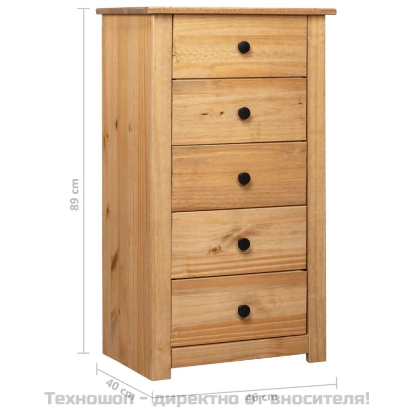 Вземете си страхотно допълнение към спалнята, дневната или офиса с нашия бюфет от масивна борова дървесина! Може да се използва и като поставка за телефон до вашия диван! Изработен от масивна борова дървесина, този шкаф с чекмеджета Панама е изключително издръжлив и здрав. Шкафът предлага обширно пространство за съхранение с 5 чекмеджета. В допълнение, стабилната горна част е идеална за подреждане на декоративни предмети, фоторамки и саксийни растения. Лесно се избърсва със суха кърпа. Стойката за телефон е лесна за сглобяване.