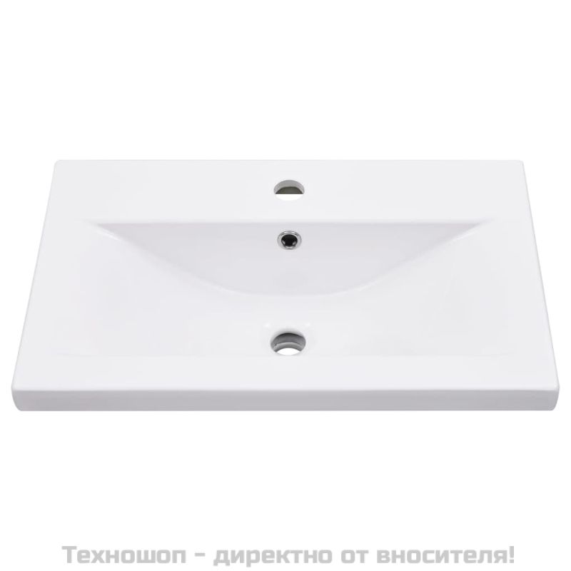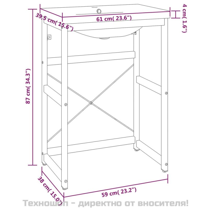Тази рамка за умивалник за баня с вграден умивалник е идеално решение за вашата баня или тоалетна с изчистена и прибрана визия. Стойката за мивка е изработена от прахово боядисано желязо, което я прави стабилна и издръжлива. Тази рамка за мивка осигурява лесен достъп до кърпи и кошници и създава по-голямо пространство от затворено място за съхранение. Изработена от керамика, мивката може да служи не само за ежедневна употреба, но и като украса във вашето жилищно пространство. Благодарение на модерния и съвременен дизайн, този умивалник определено ще подхожда на всеки декор. Също така е оборудвана с преливник за изтичане на вода, когато се напълни твърде много. Нейната лъскава повърхност носи модерен, но елегантен дизайн. Освен това рамката на умивалника и мивката се почистват лесно с влажна кърпа. Моля, обърнете внимание: Кранът и отводнителната тръба не са включени в доставката. Децата трябва да бъдат наблюдавани, за да се гарантира, че няма да си играят с уреда. Пазете децата далеч от зоната за сглобяване.Внимание: Прочетете внимателно инструкциите преди употреба и ги запазете за по-нататъшни справки.