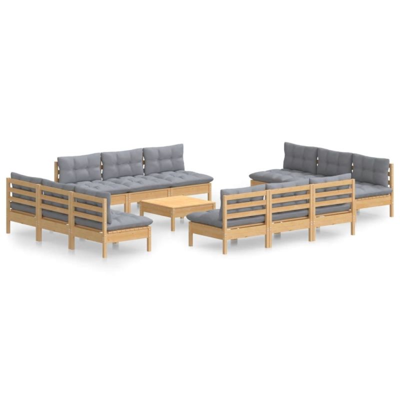 Градински лаундж комплект със сиви възглавници, 13 части, бор