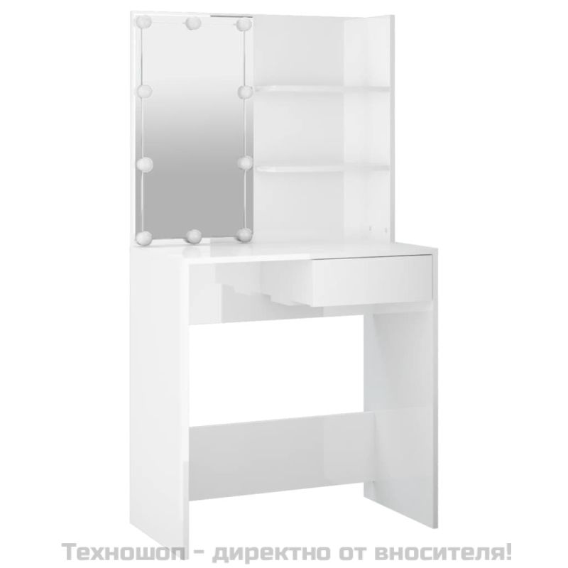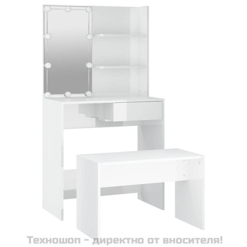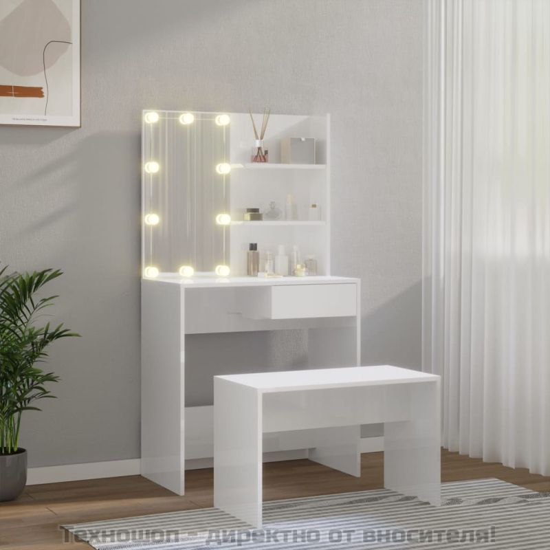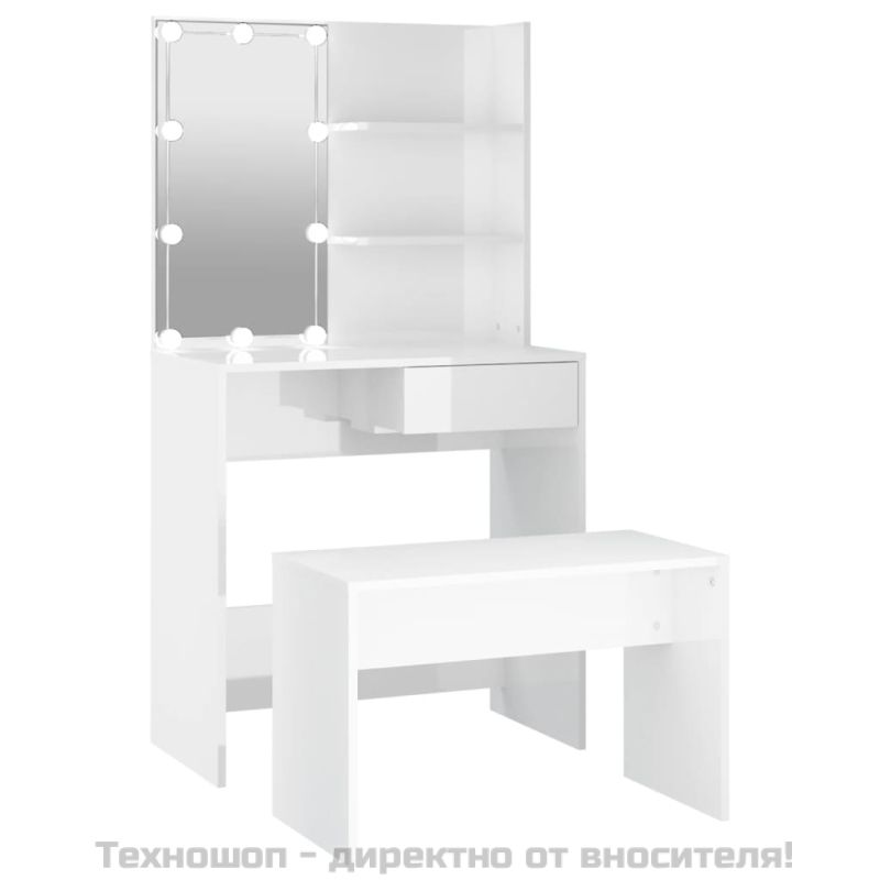 Комплект тоалетка с LED, бял гланц, инженерно дърво