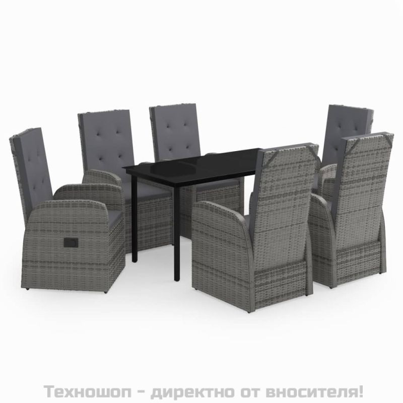Този стилен градински трапезен комплект е предназначен да бъде фокусна точка на вашата градина или вътрешен двор! Той е чудесен избор за хранене на открито или за почивка на открито! Прахово боядисаните стоманени рамки правят масата и столовете здрави и стабилни за ежедневна употреба на открито. Благодарение на водоустойчивия PE ратан, столовете са лесни за почистване и издръжливи. Облегалката се накланя чрез издърпване на бутона отстрани. Благодарение на олекотената конструкция, те са лесни за преместване. Дебело подплатените възглавници на седалките също добавят допълнителен комфорт. Полиестерните калъфки не се нуждаят от много поддръжка и могат да се свалят и перат. Освен това, гладкият стъклен плот се почиства лесно с влажна кърпа и е идеален за поставяне на ястия, напитки и различни декоративни предмети. Забележка: За да удължите живота на вашите градински мебели, ви препоръчваме да ги защитите с водоустойчиво покривало. Максимално 110 кг на седалка. Съобразете се с риска от открит огън и други източници на силна топлина в близост до продукта.
