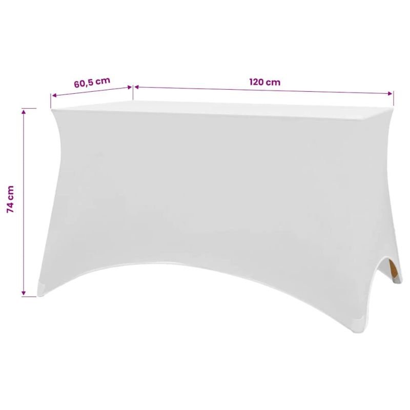 Тези еластанови калъфи за маси ще бъдат идеални за приеми, сватби, банкети и партита от всякакъв вид. Калъфите защитават вашата маса от драскотини, разливания и петна. Те ще паснат на правоъгълни маси с дължина до 120 см, ширина до 60,5 см и височина до 74 см. Изработени от еластичен плат, тези покривки могат просто да бъдат фиксирани под краката на масата. Тъй като тъканта съдържа 10% ликра, покривките-калъфи винаги ще са с добра форма. Калъфите изискват ниска поддръжка и са за многократна употреба. Перат се на 40 ° С. Доставката включва 2 бр покривни калъфа за маса.