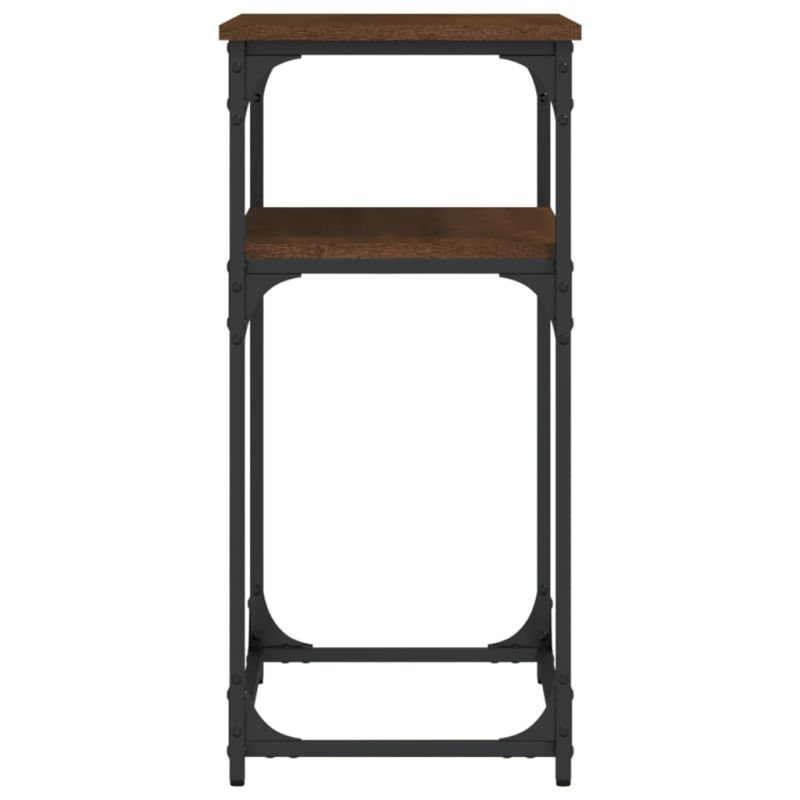 Добавете нотка елегантност към вашето антре, всекидневна или коридор с тази стилна конзолна маса. Издържлив материал: Инженерната дървесина е с изключително качество с гладка повърхност и също така се отличава със здравина, стабилност и устойчивост на влага. Изработена от инженерно дърво, холната маса е лесна за почистване.Достатъчно място за съхранение: Холната маса предлага достатъчно място за съхранение, за да съхранявате вашите списания, книги, декоративни предмети и други ежедневни неща добре организирани и на достъпно място.Регулируеми крачета: Четири регулируеми крачета с пластмасови подложки поддържат страничната масичка балансирана на неравен терен и увеличават стабилността.Метална рамка: Металната рамка добавя индустриален стил към вашия интериор, като същевременно гарантира издръжливост и стабилност. Внимание:За предотвратяване на преобръщане този продукт трябва да се използва с предоставения анкер за стена.