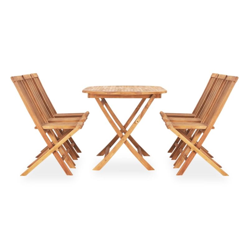 Този елегантен трапезен комплект от тиково дърво масив е предназначен да се превърне в централно място във вашата градина, тераса или вътрешен двор. Комплектът е изработен от изключително издръжлива тикова твърда дървесина, която е суха – изсушена в пещ и фино шлифована, за да ѝ се придаде много гладък вид. Тиковото дърво е известно със забележителната си здравина и устойчивост на атмосферни влияния, което го прави далеч по-подходящо за градински мебели от всеки друг вид дърво. Тиковата дървесина е идеалният избор, ако искате да закупите дълготрайна градинска мебел. Трапезната маса и столове могат да се сгъват, за да пестят място, когато не се използват.