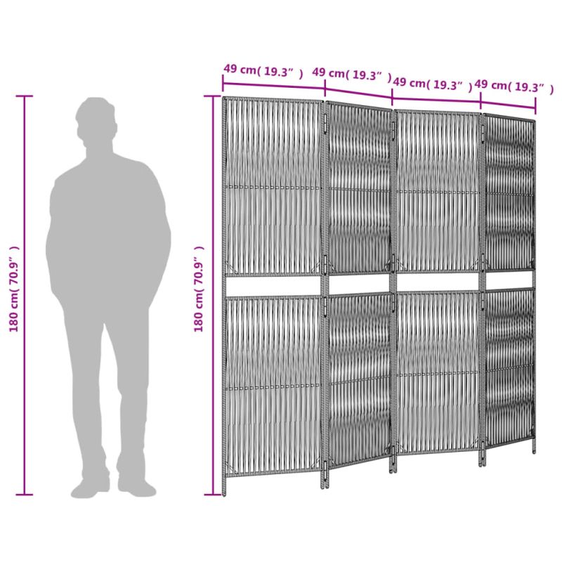 Декорирайте дома си и разпределете пространството си с този полиратанов параван за стая. Издръжлив и лесен за почистване: Всеки параван за уединение е изработен от полиратан, който е устойчив на атмосферни влияния, издръжлив и лесен за почистване.Стабилна рамка: Прахово боядисаната стоманена рамка осигурява здравина и стабилност.Гъвкав и лесен за сгъване: Всяка преграда е свързана с поцинковани панти и може лесно да се сгъва до известна степен според вашите нужди, за да спестите място.Дизайн с плетени линии: С дизайн с плетени линии, този параван за стая ще ви даде стилен и артистичен начин да увеличите уединението, като същевременно поддържате стаята проветрива и светла.Многофункционален: Параванът за разделяне на стая е чудесен за създаване на лично пространство както на закрито, така и на открито, като спалня, всекидневна, офис и др. Можете също да го поставите пред прозорец, за да блокира интензивната слънчева светлина. Важна забележка:За да се сгъне напълно плоско, трябва да се разглобят поцинкованите панти.