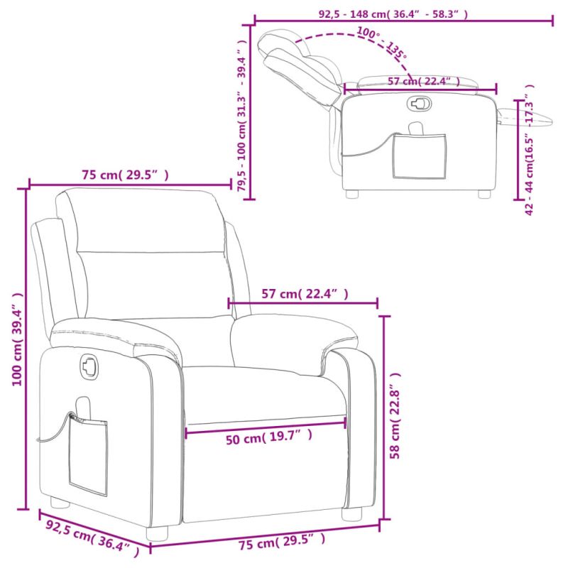 Облегнете се и се отпуснете в този изключително комфортен масажен наклоняем стол! Функция за ръчно накланяне: Този накланящ се стол има дръжка от дясната страна. Можете ръчно да настроите поставката за крака и облегалката до произволна позиция според вашето удобство с просто издърпване на дръжката. Тази функция позволява максимален наклон от 135 градуса. Освен това облегалката може бързо да се върне на първоначалното си място с лесно издърпване на дръжката.Функция за вибрация: Представените 6 масажни точки ви позволяват да изпитате по-целенасочен масаж. Освен това включеното ръчно управление ви позволява да избирате различни програми за масаж. Функцията за масаж се захранва от USB конектора, но сертифицираният 5V USB източник на захранване не е включен.Удобно седене: Дебело подплатената седалка, облегалката и широките подлакътници, покрити с кадифе, осигуряват уютно и топло усещане, което ви кара да се чувствате като в прегръдка, докато седите. Кадифето е мека и удобна материя, която се усеща приятно върху кожата.Удобен страничен джоб: Този фотьойл има страничен джоб за вашето дистанционно управление или за поддържане на вашите основни вещи леснодостъпни.Здрава и стабилна рамка: Рамката, изработена от дърво и метал, осигурява здрава структура и стабилност. Този накланящ се фотьойл е удобен и издръжлив. Максимално 110 кг на седалка. Този продукт се захранва с DC 5V, но сертифицираният 5V USB източник на захранване не е включен в комплекта. По-високото напрежение може да доведе до прегряване на устройството и да доведе до повреда на устройството и потенциален риск от прегряване и пожар.