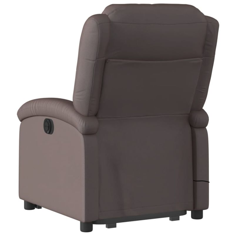 Облегнете се и се отпуснете в този изключително комфортен изправящ масажен и наклоняем стол! Функция за повдигане: Този стол реклайнер е оборудван с електрически двигател с функция за повдигане. Благодарение на функцията, която избутва целия стол нагоре, можете лесно да стоите, без да натоварвате гърба и коленете си с просто натискане на бутона.Функция за ръчно накланяне: Този накланящ се стол има дръжка от дясната страна. Можете ръчно да настроите поставката за крака и облегалката до произволна позиция според вашето удобство с просто издърпване на дръжката. Тази функция позволява максимален наклон от 135 градуса. Освен това облегалката може бързо да се върне на първоначалното си място с лесно издърпване на дръжката.Функция за вибрация: Представените 6 масажни точки ви позволяват да изпитате по-целенасочен масаж. Освен това включеното ръчно управление ви позволява да избирате различни програми за масаж. Функцията за масаж се захранва от USB конектор, който изисква сертифициран 5V USB захранващ източник (не е включен).Удобно седене: Дебело подплатената седалка, облегалката и широките подлакътници, покрити с естествена кожа, осигуряват уютно и топло усещане, което ви кара да се чувствате като в прегръдка, докато седите. Естествената кожа е естествен и непреходен материал. Може да издържи цял живот с подходящи грижа и поддръжка. Гладката повърхност също придава стилен вид, като същевременно гарантира оптимален комфорт. Удобен страничен джоб: Този фотьойл има страничен джоб за вашето дистанционно управление или за поддържане на вашите основни вещи леснодостъпни.Здрава и стабилна рамка: Рамката, изработена от дърво и метал, осигурява здрава структура и стабилност. Този накланящ се фотьойл е удобен и издръжлив. Максимално 110 кг на седалка.Този уред може да се използва от деца на възраст от 8 години и повече и от лица с намалени физически, сетивни или умствени способности или с липса на опит и познания, ако са получили надзор или инструкции за безопасно използване на уреда и разбират свързаните с него опасности. Децата не трябва да си играят с уреда. Децата не трябва да почистват и да извършват потребителска поддръжка без надзор.