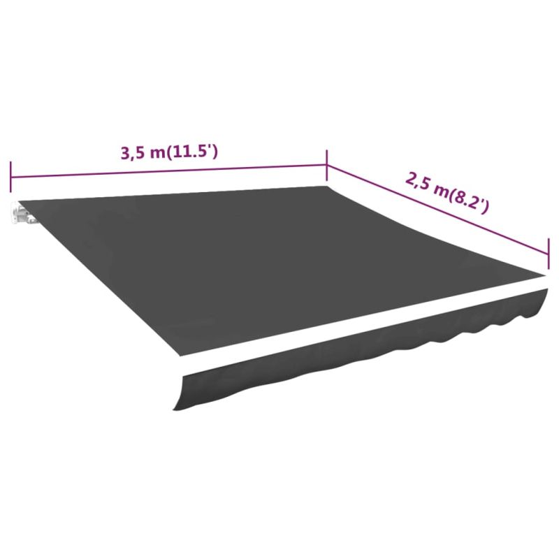 Това платно за тента, което може да се монтира върху съществуващата рамка на тента, е перфектен избор за защита от вредните ултравиолетови лъчи, осигурявайки ви прохладна и приятна сянка във вашия двор, тераса или градина. Идеално е за рамки за тенти с размер 3,5 x 2,5 м. С атрактивния си цвят, сенникът ще се превърне в идеално допълнение към вашата градина. Изработено от устойчив на ултравиолетови лъчи полиестер, това платно за тенти е много издръжливо за дълги години експлоатация. Забележка: Това платно за тента се състои от 1 основен плат и 1 волан. Доставката не включва рамката. Това е висококачествено резервно платнище за хора, които вече имат рамка.