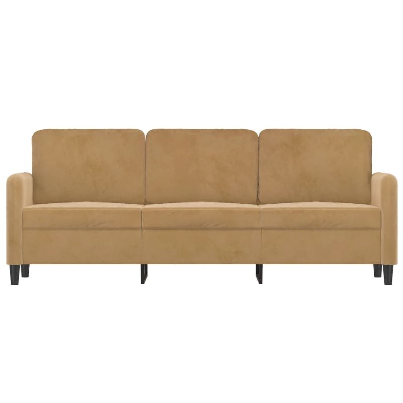 Този 3-местен диван е отлично място за вашето време за разговори, четене, гледане на телевизия или просто почивка. Той е предназначен да бъде фокусна точка във вашия дом. Меко кадифе: Кадифето е мека и луксозна материя, която се отличава с гъста купчина равномерно отрязани влакна за гладка повърхност. Кадифената тъкан се отличава с меко усещане, което я прави приятна на допир.Здрава и стабилна рамка: Металната рамка на тапицирания диван осигурява здравина и стабилност.Удобна седалка: Диванът е много удобен с дебело подплатените седалки, подлакътниците и възглавниците за гърба.Привличащ вниманието дизайн: С изчистен, но модерен дизайн, това канапе е предназначено да привлича вниманието във вашата стая. Максимално 110 кг на седалка. Съобразете се с риска от открит огън и други източници на силна топлина в близост до продукта.