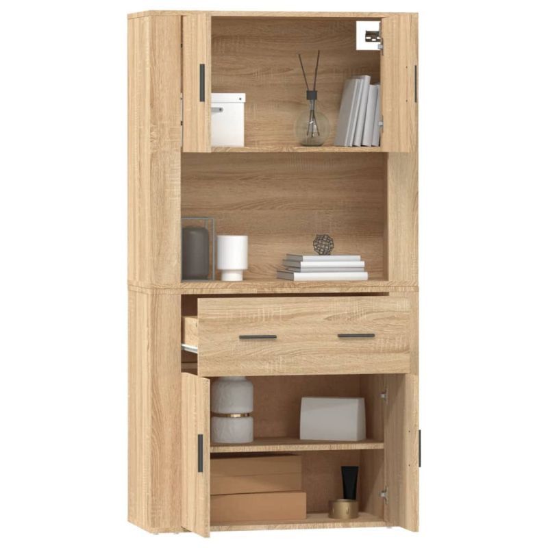 Търсите стилен висок шкаф? Този висок шкаф добавя уникален чар към вашия интериор! Издържлив материал: Инженерната дървесина е с изключително качество с гладка повърхност и се отличава със здравина, стабилност и устойчивост на влага.Достатъчно място за съхранение: Сайдбордът предоставя достатъчно място за съхранение, където да държите различни ваши вещи добре организирани и леснодостъпни.Функция за монтиране на стена: Шкафът за съхранение може да се монтира на стената в горната част на бюфета, за да се създаде висок шкаф, което спестява място на пода. По този начин можете да увеличите максимално пространството на пода и да поддържате ред и чистота. Добре е да се знае:За да бъде сглобяването възможно най-лесно, всеки продукт се доставя с ръководство.Винтовете и дюбелите за вътрешната стена не са включени. Съветваме ви да намерите и използвате винтове и дюбели, подходящи специално за вашите стени. Ако не сте сигурни, можете да се консултирате с професионалист. Моля, прочетете и следвайте всяка стъпка от инструкциите. Внимание:За предотвратяване на преобръщане този продукт трябва да се използва с предоставения анкер за стена.