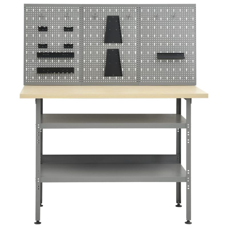 Този комплект е комбиниран с 1 работна маса и 3 стенни панела и представлява практично решение за съхранение във вашата работилница и гараж. Издръжлива работна маса, която се отличава с достатъчно място за съхранение и 300 кг товароносимост. Тази работна маса има 2 големи рафта за лесно поставяне на бормашини, барабани за кабели, шлайфове и други инструменти. Освен това краката са с регулируема височина. Тази работна станция е изработена от първокласна стомана и инженерно дърво, което я прави изключително здрава, издръжлива и лесна за почистване. Сглобява се лесно. Тези панели за инструменти са изработени от солидна стомана, за да поемат тежестта на различни инструменти, като свредла, клещи, отвертки и гаечни ключове. Тези панели са перфорирани за лесно и сигурно фиксиране на инструментите. 3-те стенни панела могат да бъдат фиксирани заедно за допълнителна здравина. Той е идеално допълнение към вашата работна маса и шкафове за работилница с практична ширина от 120 см.