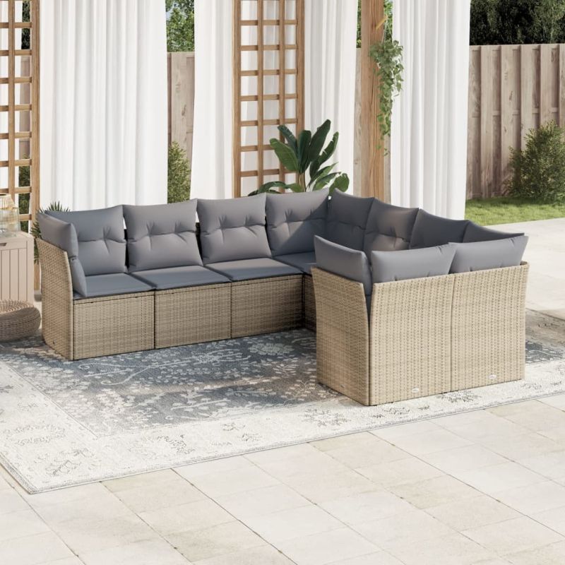 Градински диван с възглавници, 8 части, бежов полиратан